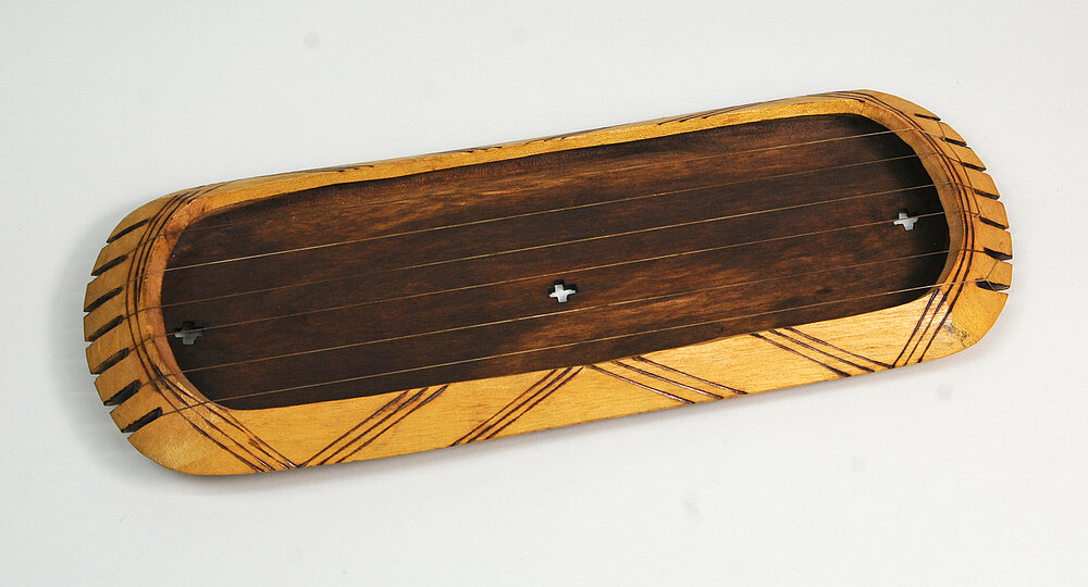 7 Saiten (genauer 1 Saite, die seriell durch die Kerben am oberen und unteren Rand gezogen wird).