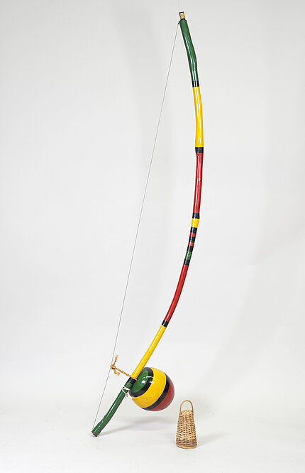 Kürbisresonator (cabaça), mit Schnur über Saite und Bogen gespannt