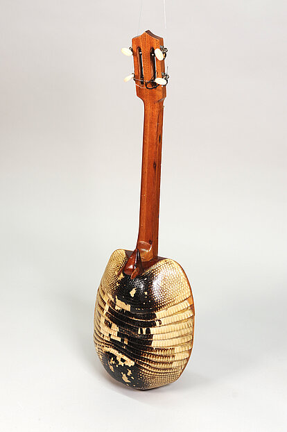 Auf dem Korpus hinter dem Halsansatz ein geschnitzter Gürteltierkopf mit aufgenagelten und angeleimten Plättchen als Ohren