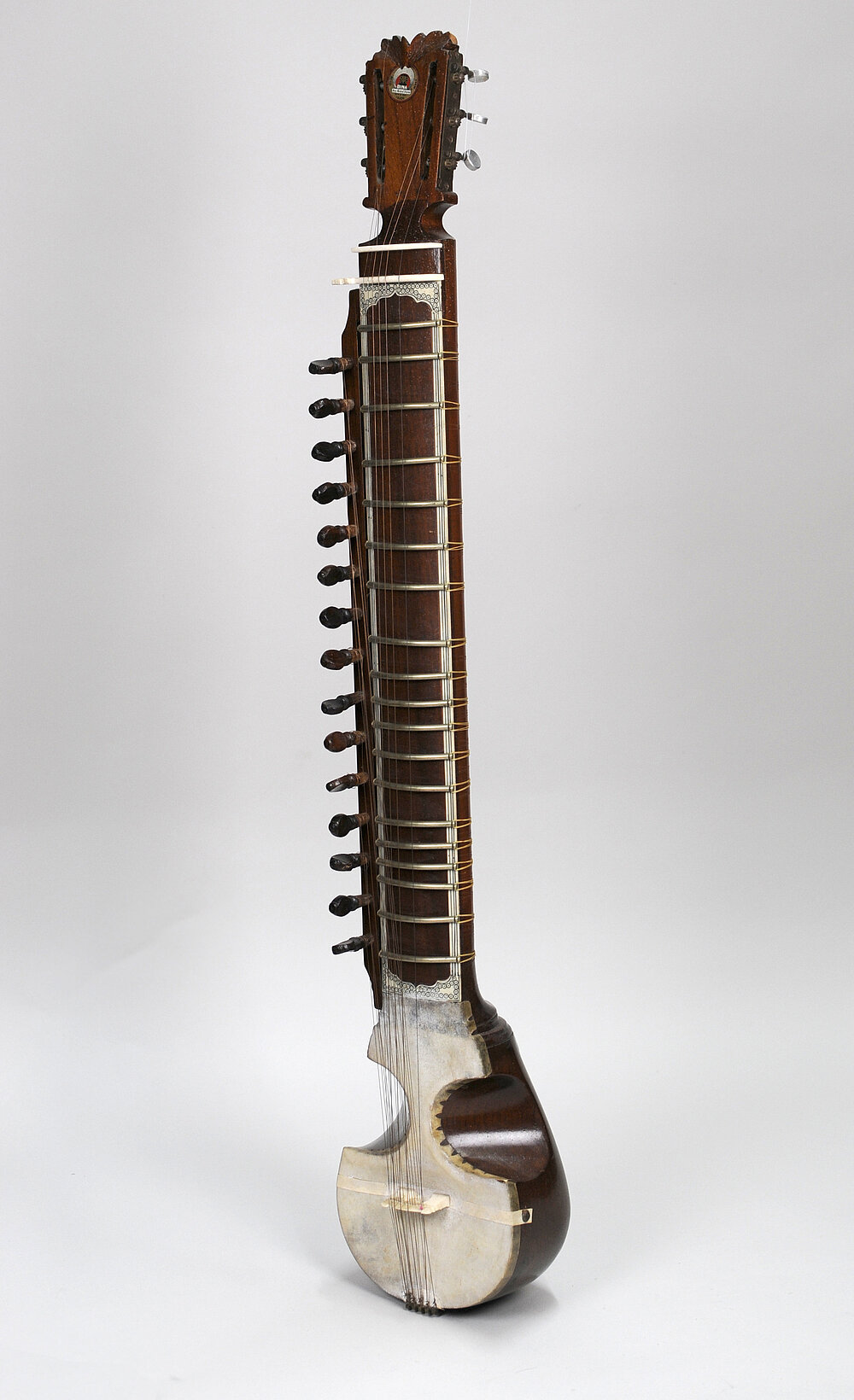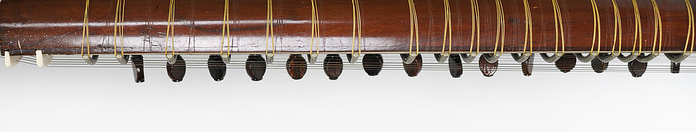 6 Spielsaiten (Mensur 70 vm), 15 Resonanzsaiten. 19 Bünde.