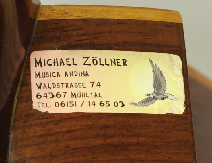 Verkäuferetikett auf der Zarge links neben dem Hals: "MICHAEL ZÖLLNER | MUSICA ANDINA | WALDSTRASSE 74 | 64367 MÜHLTAL | TEL. 06151 / 14 65 03" [Bild: Kondor vor Sonne]
