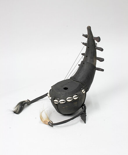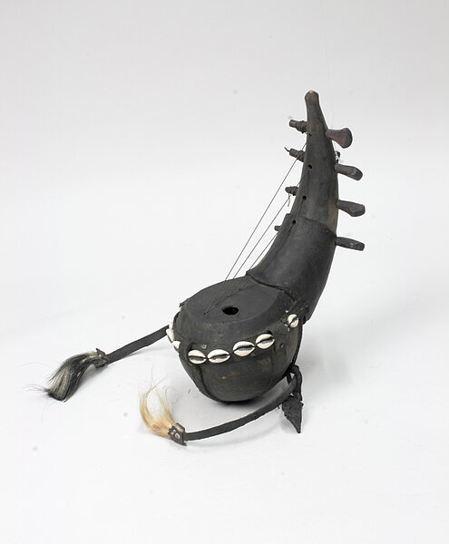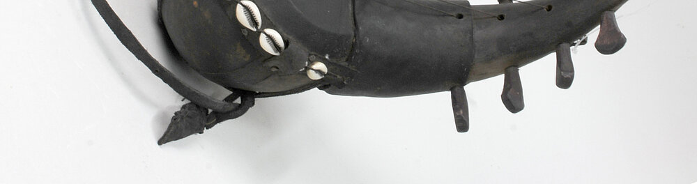 Hals aus Kuhhorn, darin Bohrungen: frontal 4 Saitenkanäle, an den Seiten 2 x 4 Wirbelkanäle; 4 Holzwirbel