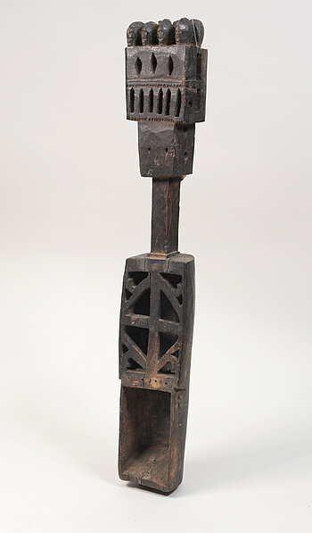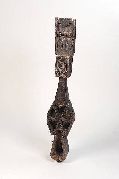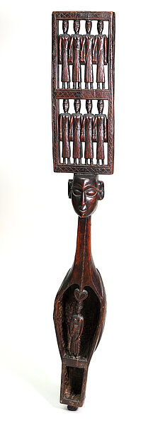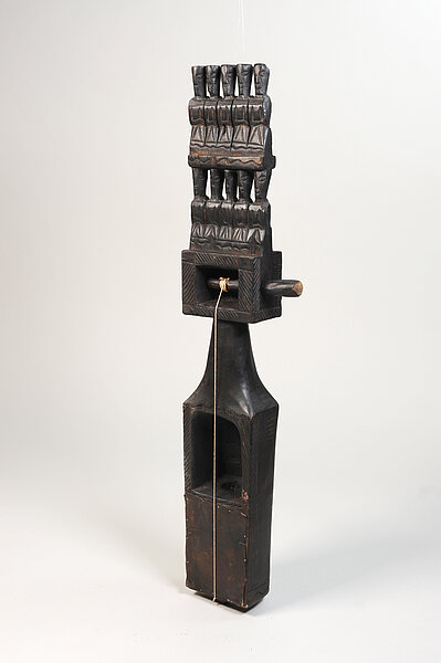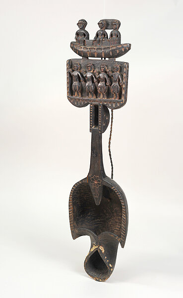 Korpus in Sarinda-Form mit Resten der Fellbespannung im unteren Bereich (Bauch/Unterleib); (untypischerweise) vorne geöffneter Wirbelkasten. Bohrungen für 3 Wirbel. Auf der Kopfplatte vier Tänzerinnen, darüber ein Boot mit einer dreiköpfigen Familie (Vater, Mutter, Kind in der Mitte).