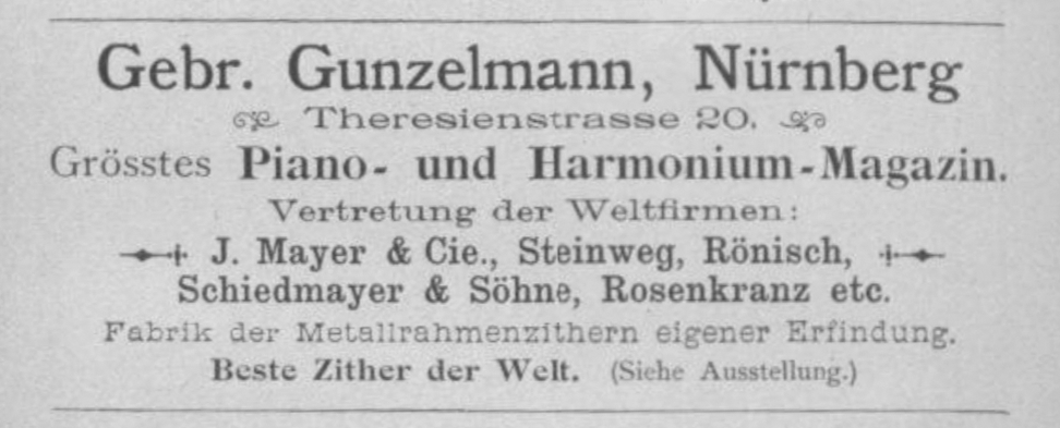 Eintrag im: Handbuch der Leistungsfähigkeit der gesammten Industrie Deutschlands, Œsterreichs Elsass-Lothringens und der Schweiz, 1874, S. 70: "Gebr. Gunzelmann, Pianofortefabrik. Von dem Alleininhaber Franz Joh. Gunzelmann gegründet." – Eintrag im Weltadressbuch der gesammten Musikinstrumenten-Industrie, 1890, S. 53: "Gunzelmann, Gebr., Theresienstr. 20, Pianofabrik u. Hdlg. u. Patent-Metallrahmen-Zither-Fabrik. Gegr. 1840. D. R. P. 33512."