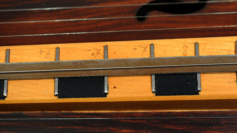 Griffbrett (Ahorn), mit 31 Metall-Bundstäbchen. Auf der Spielerseite sind die jeweils geradzahligen Bundzwischenräume rechteckig schwarz lackiert. Auf der gegenüberliegenden Seite sind Intervalle (die Zahlen der Ziffern-Notation) aufgezeichnet (-2, +2, -3, +3 etc.).