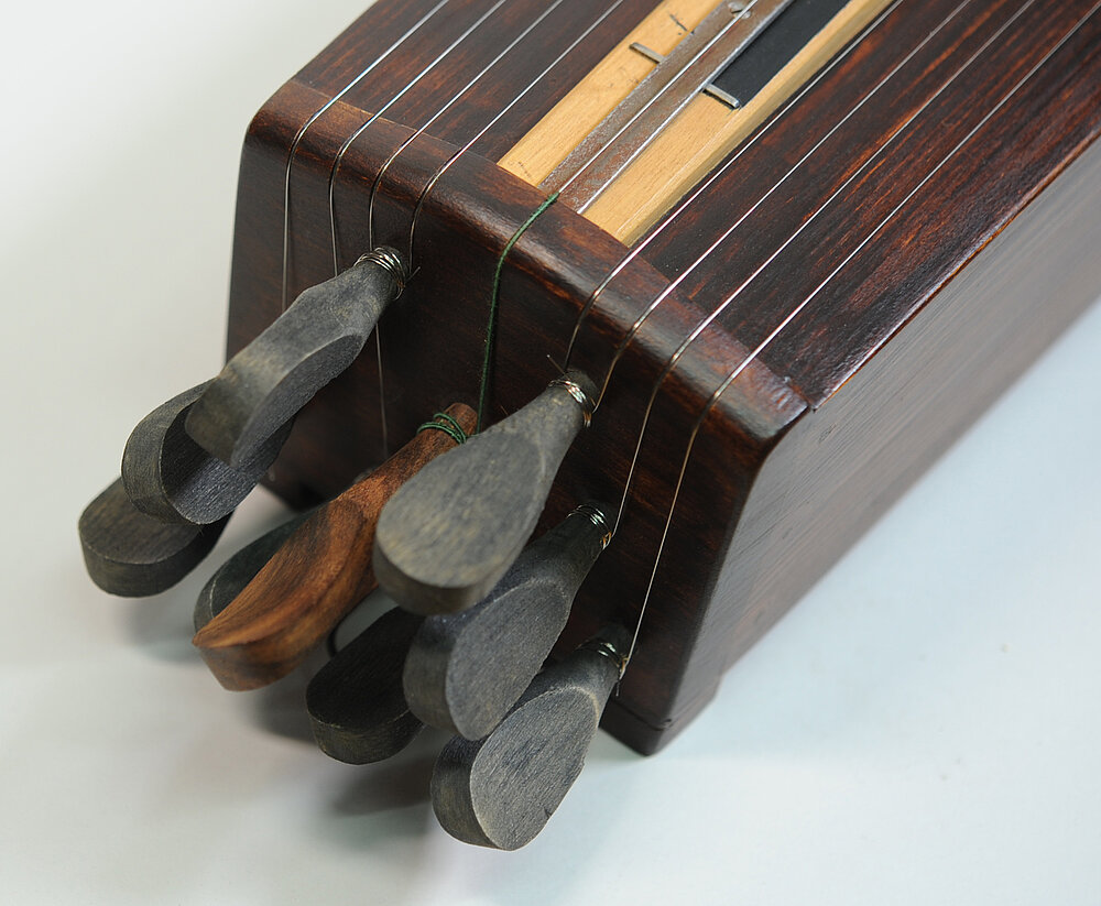 9 große Wirbel in der kurzen Wand. Die Wirbel für die Resonanzsaiten sind schwarz, der Wirbel für die Melodiesaite ist dunkelbraun gebeizt. 3 Schrauben als Saitenanhänge in der gegenüberliegenden längeren Wand. Schwarz lackierter Saitenhalter aus Blech mit integriertem Feinstimmer.