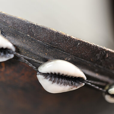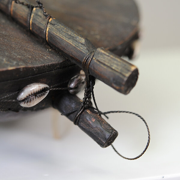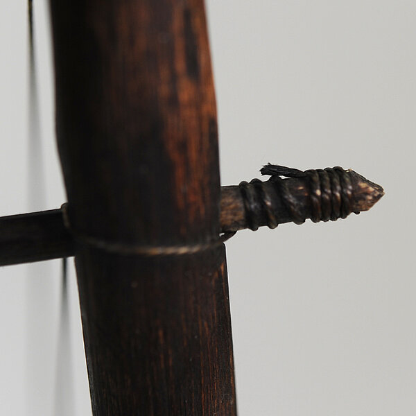 Der Hals verläuft durch den Resonator und tritt an dessen vorderem Ende aus. Verbunden ist das Ende des Halsstücks durch eine Schnur mit dem unter der Decke und im vorderen Drittel austretend angebrachten Saitenhalterleiste. Die Ziegenfellbespannung ist auf die Resonatorkalebasse genagelt. Ein verstärkender Lederstreifen ist mit 26 aufgenähten Kaurischneckenhäusern verziert.