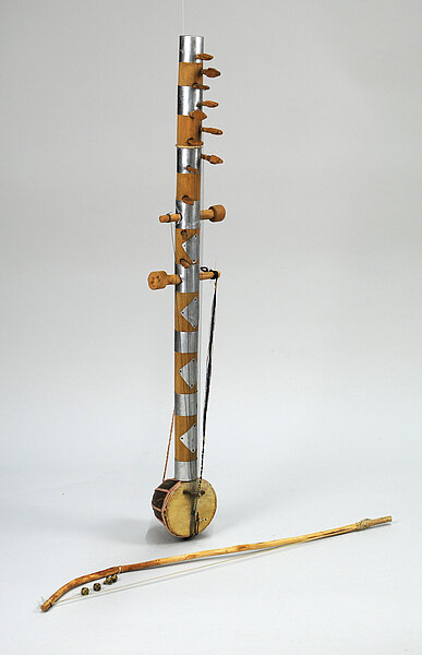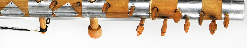Hals: Bambusrohr, verziert mit aufgenagelten verzinkten Blechringen und -rauten