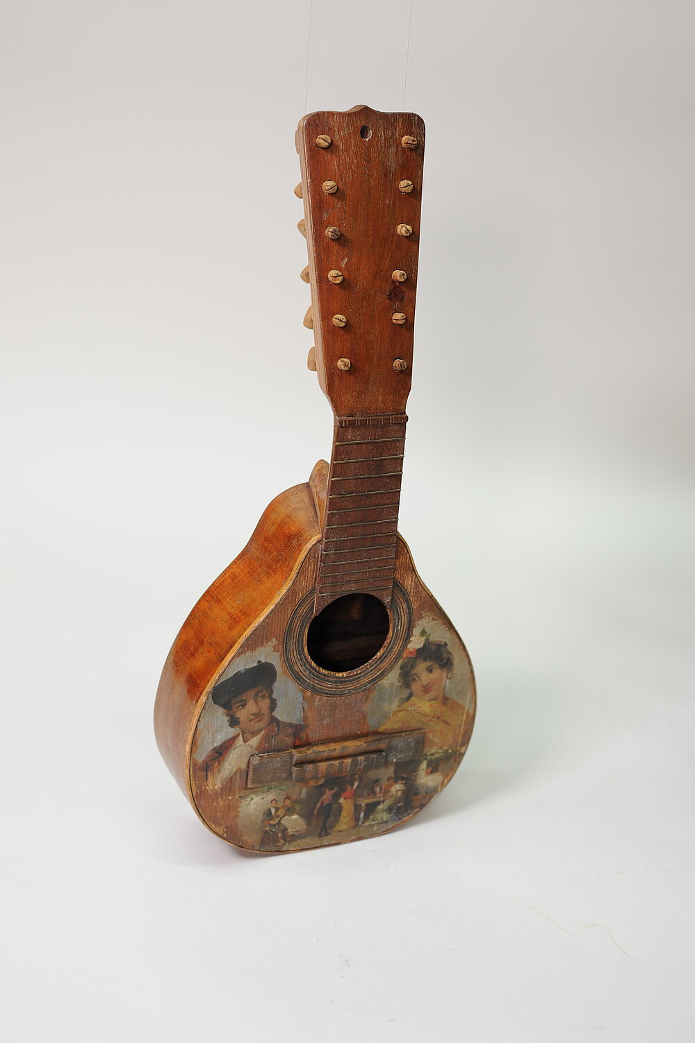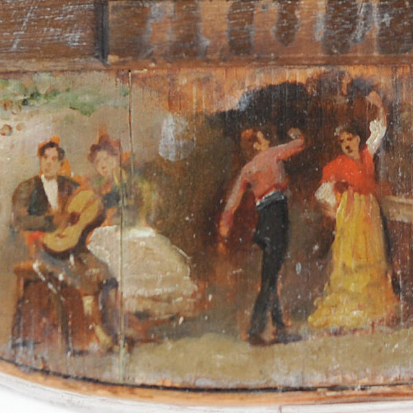 Bei der Darstellung einer Paartanz-Szene mit Temperafarben auf der Decke handelt es sich vermutlich um eine Verzierung des 20. Jahrhunderts. Sie wurde aufgebracht, als das Instrument noch mit Saiten bezogen war. Der Bereich zwischen Griffbrett und Steg ist ausgespart. Dargestellt ist ein Blickkontakt aufnehmendes Paar im oberen Register seitlich der Schalllöcher und einer Tanzszene im Register unterhalb des Stegs.
