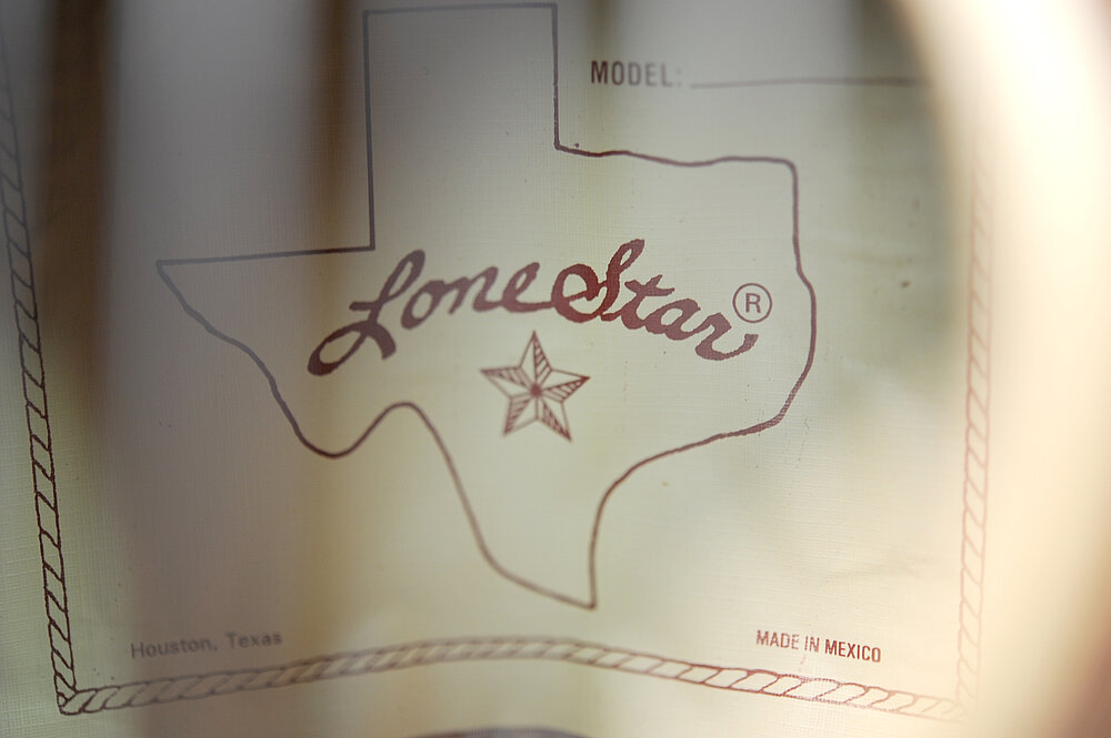 Zettel auf der Innenseite des Bodens: Rahmung in Form eines gewundenen Stricks, darin als Rahmen der Grenzumriss des US-Bundesstaats Texas für den Firmennamen: "Lonestar® | [fünfzackiger Stern] | [außerhalb dieses Rahmens rechts oben] MODEL: [unausgefüllt] | [links unten] HOUSTON, TEXAS | [rechts unten] MADE IN MEXICO"