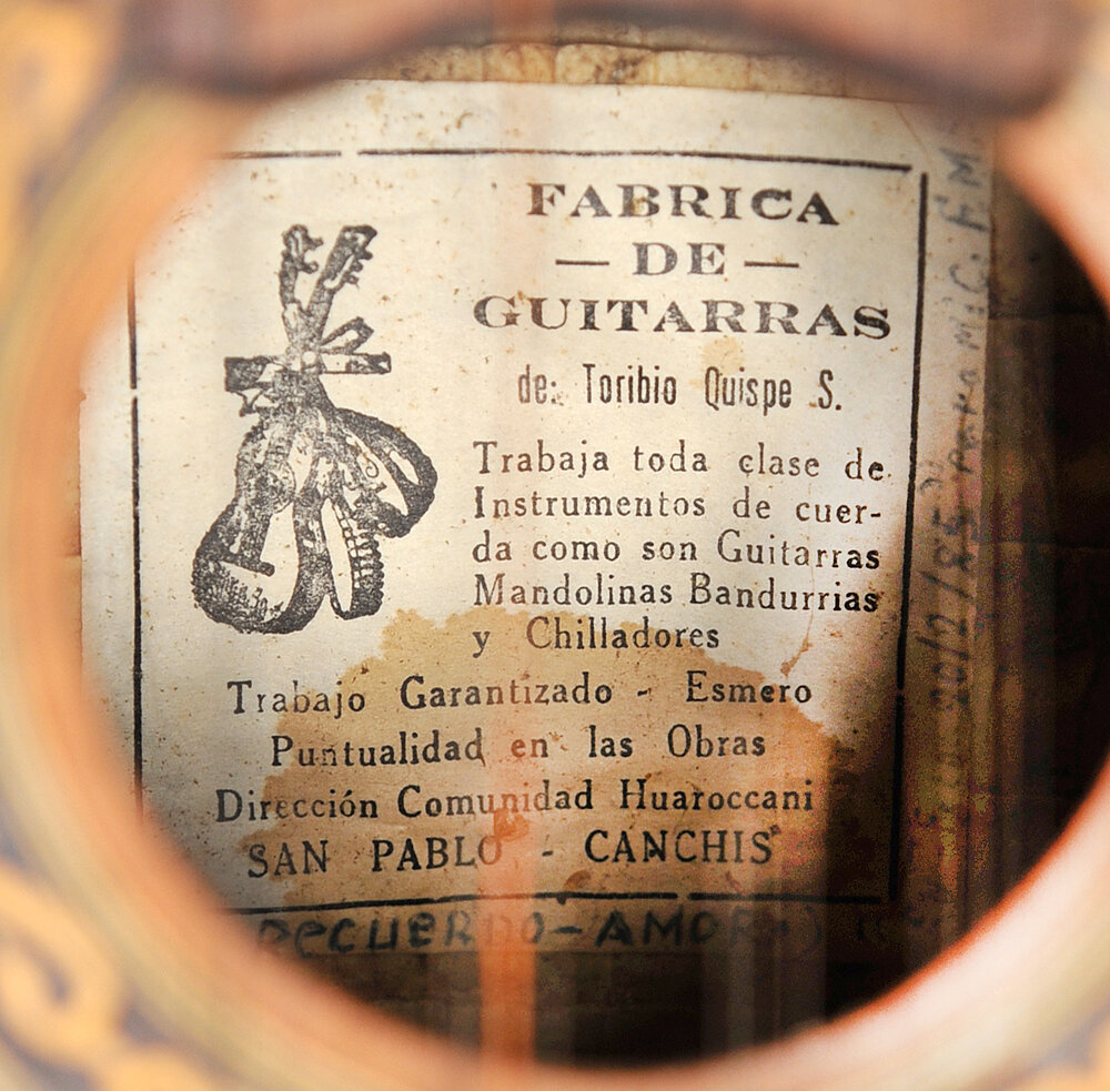 Zettel: "FABRICA | DE | GUITARRAS | de: Toribio Quispe S. | Trabaja toda classe de | Instrumentos de cuer-| da como son Guitarras | Mandolinas Bandurrias | y Chilladores | Trabajo Garantizado - Esmero | Puntualidad en las Obras | Dirección Comunidad Huaroccani | SAN PABLO - CANCHIS"