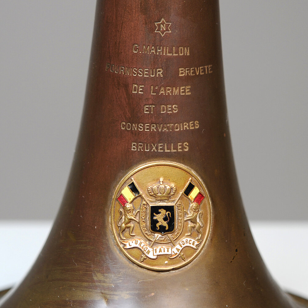 Ventilposaune der Brüsseler Firma C. Mahillon in der Chaussée d'Anvers 21, gegründet 1836, war spezialisiert auf den Bau und die Entwicklung von Blasinstrumenten und Schlagzeug. Ein Sohn des Gründers war Victor-Charles Mahillon, der 1865 Teilhaber wurde. Er gründete später das Musée instrumental du Conservatoire royal de musique, dessen fünfbändigen systematischen Katalog er 1890 publizierte.