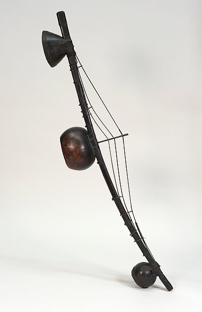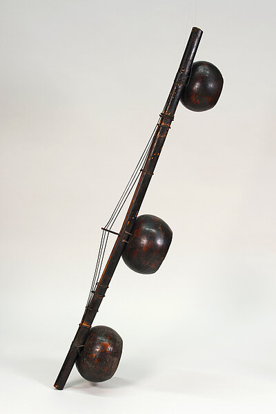 3 (ursprünglich 4) idioglotte Saiten, aus Raphiapalme geschnitten, an Kerbsteg eingehängt