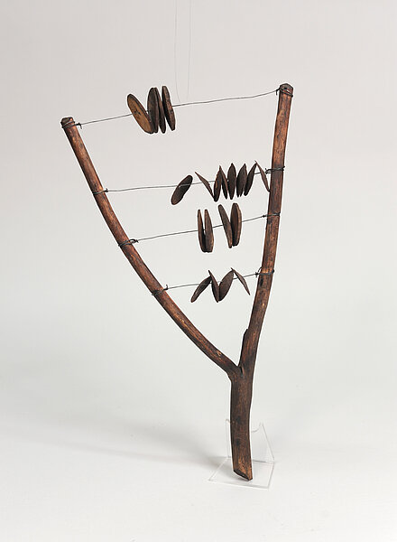 Astgabel, 4 Eisendrähte mit alternierend getrockneten Kürbis- und Blechscheiben