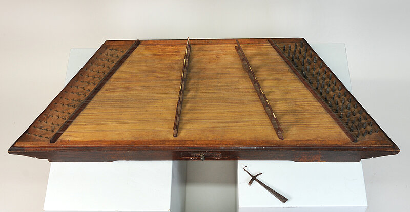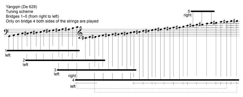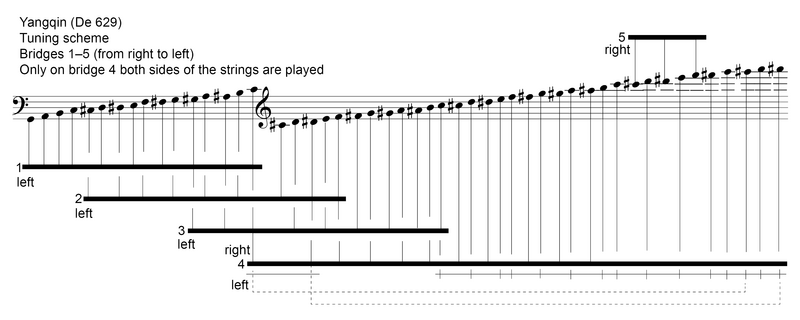 Yangqin, trapezförmiges Hackbrett der chinesischen Musik. Wie der Name sagt (yang qin = fremde Zither), wurde das Instrument nach dem Vorbild der persischen Santur gegen Ende der Ming-Dynastie (Anfang 17. Jh.) eingeführt. In der klassischen chinesischen Instrumentensystematik, dem bayin ("acht Klänge") gehört die yangqin zur Kategorie Seide. Zunächst ein Teil von Ensemblekombinationen, wurde das Instrument im 20. Jahrhundert zunehmend solistisch gespielt, was zu einer Modernisierung geführt hat: Der Umfang wurde erweitert, der Tonvorrat (nach dem Vorbild österreichischer Hackbretter) chromatisiert, es wurden zusätzliche Stege und ein neuer Stimmmechanismus eingeführt.