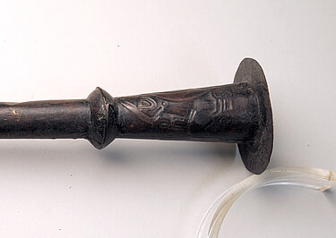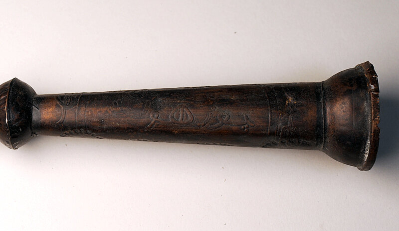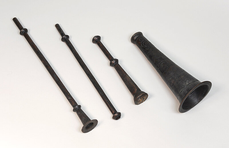 Teil 1: mit Mundstück 50,5 cm, konisch sich schließend von 2,8 cm zu 1,5 cm an der ersten Wulst. 6 cm als Zapfen zu