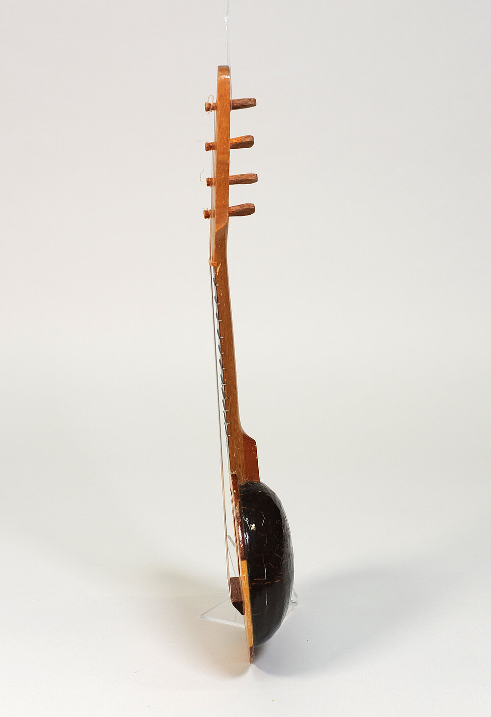 Gleich dicke, spieltechnisch unbrauchbare Nylonsaiten. Mensur 25 cm. Hinterständige Wirbel.