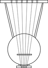 Durch den Resonator geführte Arme an den Enden verjüngt, unten zusammengehalten durch eine Querverbindung, die als Saitenhalter dient.