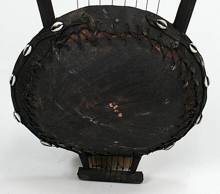 Verzierung: Seitlich rund um den Resonator Lederband mit Kaurischnecken