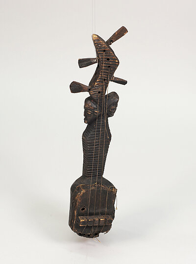 2 geschnitzte voneinander abgewandte Köpfe in der oberen Halspartie
