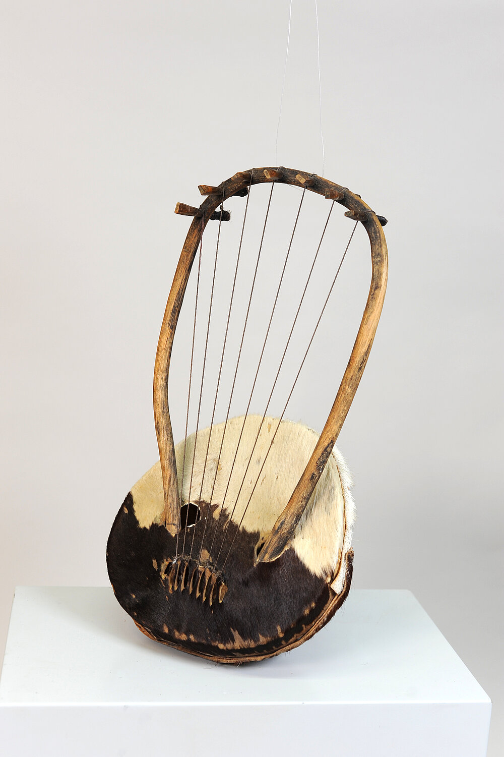 Die Saiten sind mit Wirbeln auf einen gebogenen Ast gespannt, der in einem Stück die Funktion von Armen und Joch übernimmt.