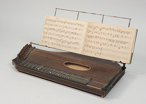 Mit ansetzbarem Notenhalter (das handschriftliche Notenheft auf dem Foto stammt von der Meindl-Zither StW 21).