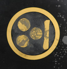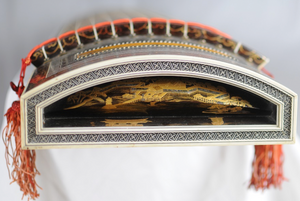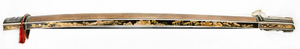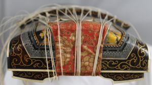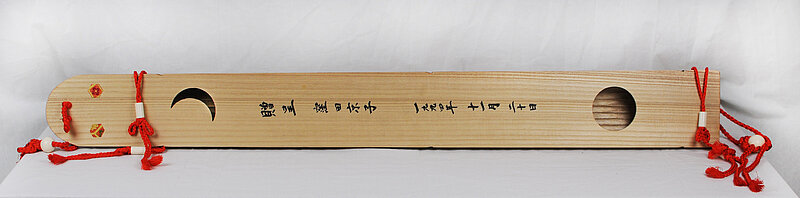 Auf einem beiliegenden Zettel sind Vermutungen über das goldene Zeichen auf dem Futteral des Instruments zu finden. Es handelt sich um das Familienwappen der vormaligen Besitzer. Die zwei möglichen lesbaren Zeichen – "Ichimonnji-Mitsuboshi" und "Mitsuboshi-Ichimonnji" – sind beide Familienwappen, die aus der Zeit der Samurai stammen. Die wahrscheinlichste Lesart (Linie unten, Kreise oben) ist "Ichimonnji-Mitsuboshi". Es handelt sich um das Familienwappen von Ōe (811), Mōri (1202) und Kikkawa (1183). Mōri und Kikkawa sind beide der Nebenlinien von Ōe.