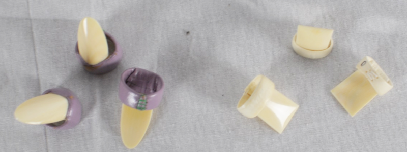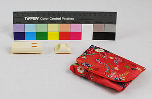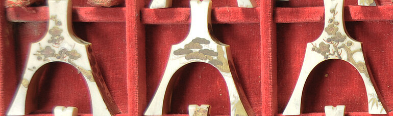 Dem Koto liegen Spielnägel der zwei unterschiedlichen Schulen bei: abgerundete Nägel (丸爪: Maru-Zume) und eckige Nägel (角爪: Kaku-Zume). In einem separaten Kästchen mit Fächerabteilung stehen 15 mit goldlackierten Floral- und Wolkenornamenten verzierte Elfenbeinstege zur Verfügung.