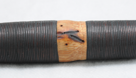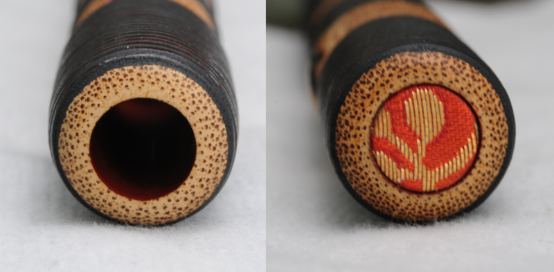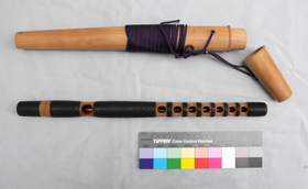 Bambus. Zwischen 2. und 5. Griffloch gerissen. Länge 40,4 cm. Innen mit Stoff ausgekleidetes Fichtenholzfutteral. Frequenzen bei nacheinander geöffneten Grifflöchern: