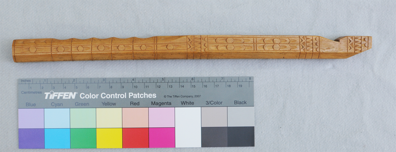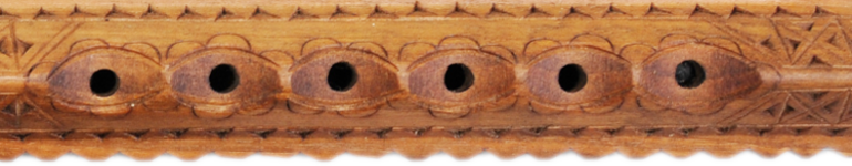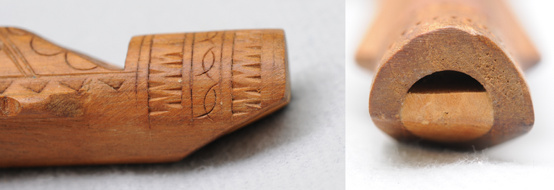 Kroatien, 1970er Jahre (?). Ahornblock. Fünf Grifflöcher, leicht schräg (3°) zur Rohrachse. Vorderständiger Rechteck-Aufschnitt. Länge 30,4 cm, von Labiumkante zu Austritt 26,9 cm, Breite 2,1 cm, Höhe 2 cm. Bohrung 11 mm. Tonhöhen bei nacheinander geöffneten Löchern ca. cis2 dis2 e2 fis2 g2 gis2.