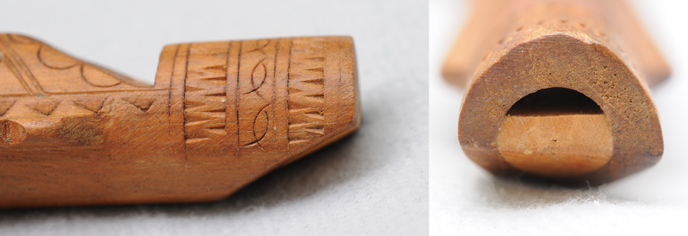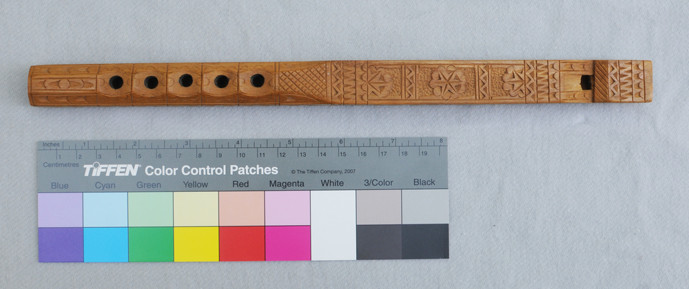 Kroatien, 1970er Jahre (?). (Auch: Svirala [Bosnien-Herzegowina], Jednogrla [Dalmatien], regionenbedingt auch in den Varianten: žveglica, jednojnica, jednojka, ćurlik, čuruminka, postranka, strančica). Einrohrblockflöte aus einem Stück (Ahorn, Block: Buche) mit vorderständigem Rechteck-Aufschnitt und sechs Grifflöchern. Am Kopf einfacher schräger Anschnitt. Geschlängelter Zierrand, standardisierte Ritz- und Schnitzmuster. Bohrung rund, 11 mm. Grifflöcher in wellenförmigen Fingervertiefungen senkrecht zur Rohrachse. Länge 32 cm, von der Labiumkante bis zum Austritt 28,9 cm, Breite 3,2 cm, am Mundstück 2,1 cm, Höhe 2,4–2,7 cm (Maximum am Austritt).
