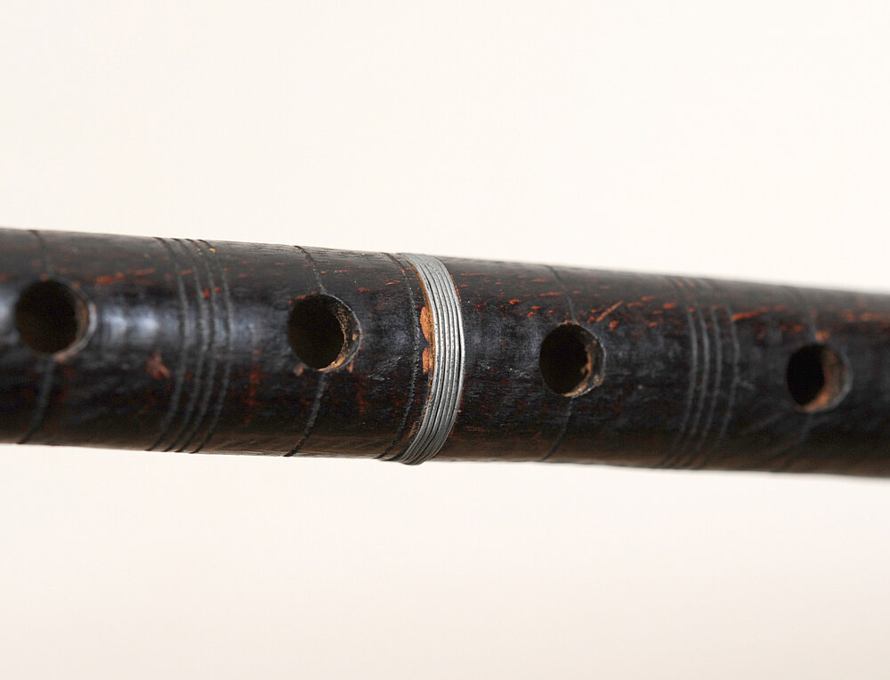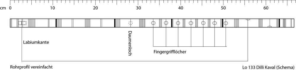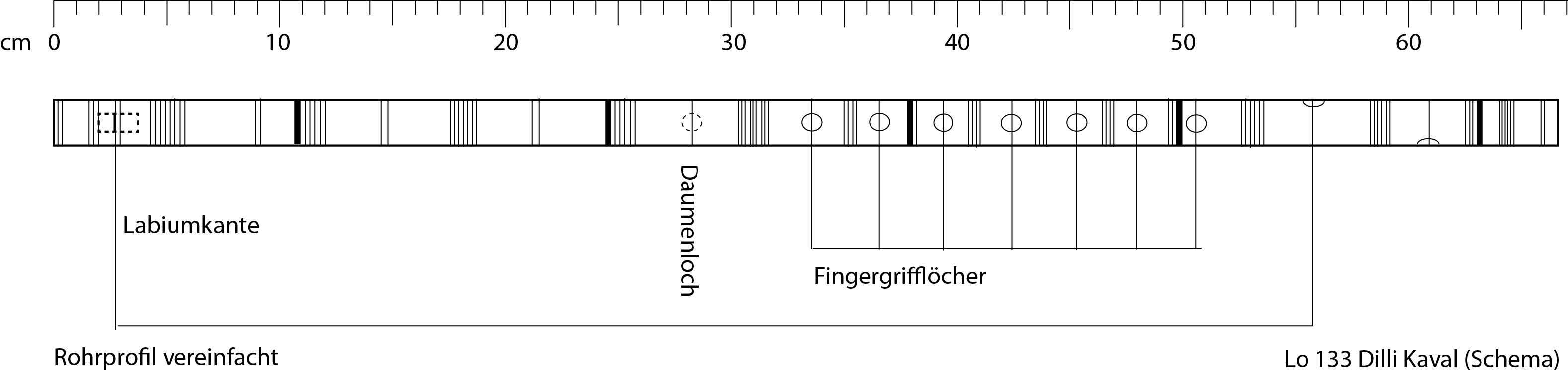 6 vorderständige Grifflöcher von 6 mm Durchmesser, 1 Daumenloch