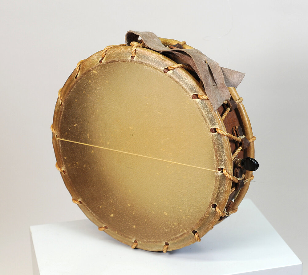 DieTrommel kann, angehängt am Lederriemen am Rahmen, mit der linken Hand gespielt werden, während rechte für eine Einhandflöte frei ist.