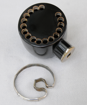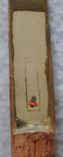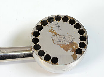9 (yo): Attrappe mit Griffloch, 15,85 cm, Ausschnitt auf der Sichtseite 4,3–6,4 cm mit Metall verkleidet, offene Zierkappe aus Metall