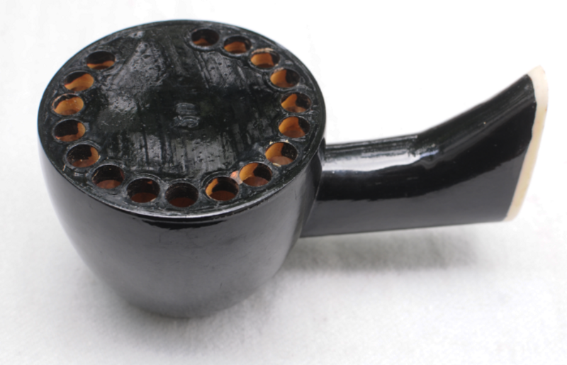 Schwarz lackierte Windkapsel aus Holz, 9 cm Durchmesser. Schuhförmiges Mundstück mit Knochenauflage.