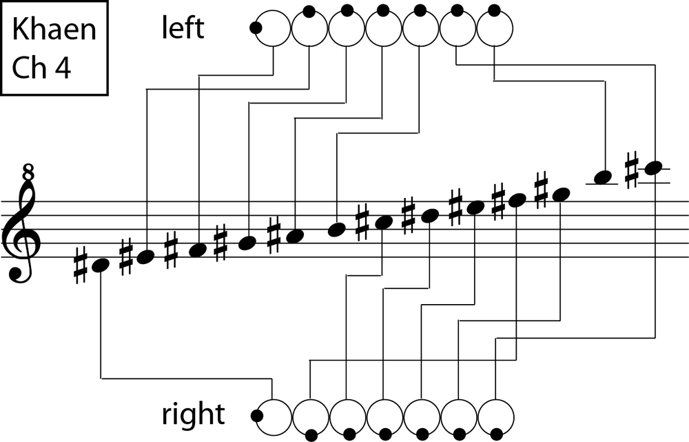 Pfeifen: 1–8 links; 1–8 rechts. Grifflöcher 1l/r ca. 1,8 cm über Windkammer, 2–7l/r ca. 6 cm, 8l/r ca. 2,8 cm. Rohrdurchmesser (Enden) zwischen 1,1 und 0,6 cm.