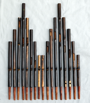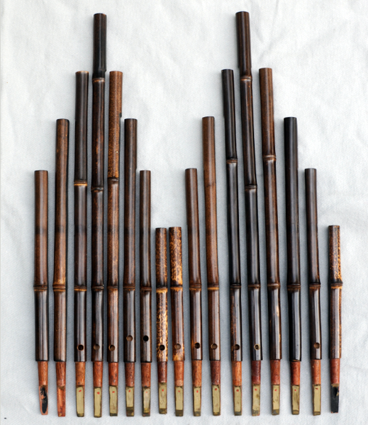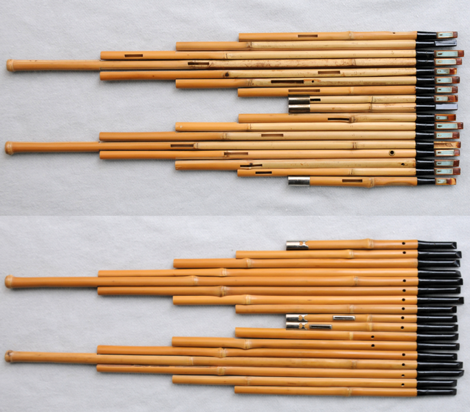 17 Pfeifenrohre, davon zwei Attrappen (9 [yo] und 16 [mo]), Griffloch auf Sichtseite, wenn nicht anders angegeben; am Ende offen, zugespitzte Enden wie die Windkapsel schwarz lackiert. Grifflöcher Nr. 1–10 ca 2 cm, Nr. 11/12 ca. 5 cm, Nr. 13–16 ca. 2,3 cm und Nr 17 ca. 3 cm über dem Windkammerdach. Die Zungen sind (im Gegesatz zur Saeng) Richtung Innenseite auf die Rohre aufgeleimt.