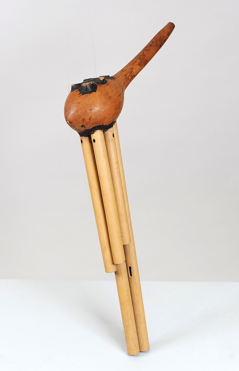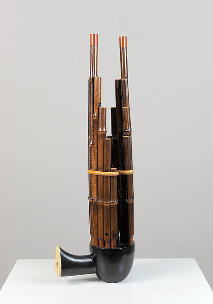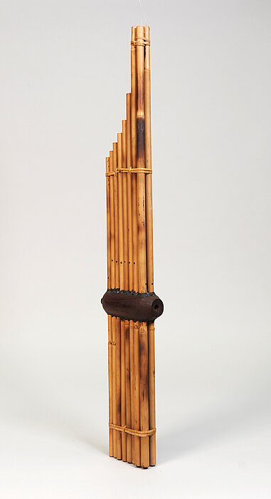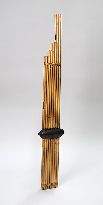 17 eingesteckte Bambuspfeifen, stabilisierender Bastring, mit Kupferdraht zusammengehalten. Die beiden längsten oben rot lackiert.
