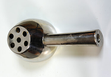 Windkapsel aus vernickeltem Messing, 10 cm Durchmesser, schuhförmiges Mundstück.
