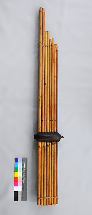 16 Bambusröhren, je vier in gleicher Länge. Durch eine Windkapsel aus Holz gesteckt und mit Pech abgedichtet. Verschnürungen mit Bast mit quer zwischen die Rohrreihen geschobenen 3,5 mm breiten parallelen Bambushölzchen. Alle Röhren haben ein Griffloch, die Grifflöcher der zwei vorderen Rohre sind spielerseitig gebohrt (Daumen), die der zwei hinteren niedriger (kleine Finger). Deutlich erkennbar sind Anrisse für die Grifflöcher. Die Röhren haben innen rechteckige Stimmschlitze.