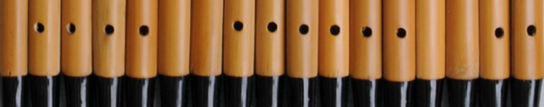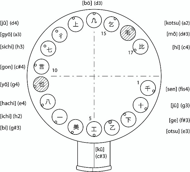 Pfeifen: (Zentimeter-Maße im Folgenden: Gesamtlänge, Ende der Zunge bis Ende des Rohrs, Stimmausschnitt vom Ende des Rohrs aus gemessen. Alle Stimmausschnitte rechteckig. Die folgende Liste gibt die japanischen Pfeifennamen in Klammern hinter der Nummer an.)