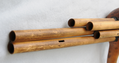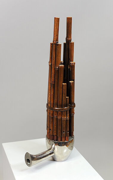 17 eingesteckte Bambuspfeifen, stabilisierender Bastring, mit Kupferdraht zusammengehalten.
