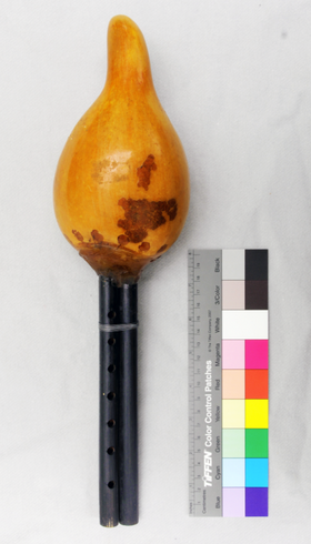 Länge 37,5 cm, max. Breite 9,2 cm, Länge der Kalebasse ca. 17 cm, Länge der Rohre bis zur Kalebasse ca. 19,5 cm. Kanaldurchmesser Bordunrohr 11 mm, Spielrohr 10 mm. Rohre schwarz lackiert. Drahtumwicklung zwischen 6. und 7. Griffloch. Bienenwachsdichtung, darum herum grobe Zierlackierung (Ring mit Blütenblatttupfen). Senkrecht gebohrte Grifflöcher von 5 mm Durchmesser, Abstand zum Luftaustritt: 30, 56, 77, 98, 118, 138, 158 mm. Grundfrequenz und Skala (vgl. Audiodatei und Spektrogramm links):