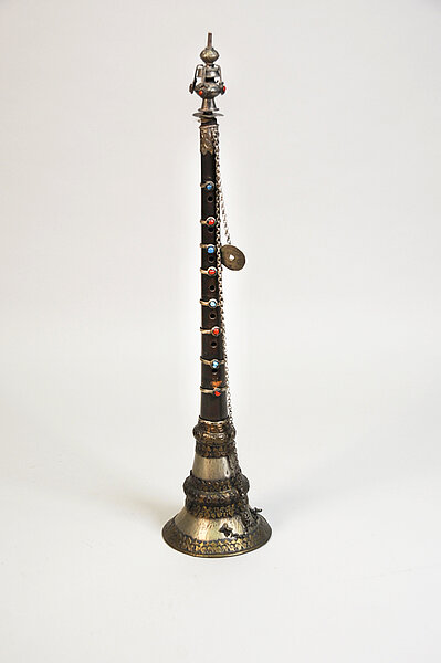 Oboe aus dem Kontext klösterlicher lamaistischer Rituale in Tibet. Bei Anrufungsritualen spielen Blasinstrumente immer paarweise und werden auch so hergestellt. Zu einem Instrumentalensemble gehören neben den gyaling die Längstrompeten (dung = "Schnecke") aus Metall (dung chen, vgl. Lo 74/Lo 75) und Schneckenhörner (dung kar). Schlaginstrumente sind: rol-mo (gebuckelte Paarbecken, vgl. Lo 76/Lo 77), silnyen (flache Paarbecken) und die Stieltrommel chos-rnga. Die gyaling wird im Gegensatz zu den anderen genannten Instrumenten auch in der weltlichen Musik gespielt. Die meisten Spieler bevorzugen ein Vibrato, gespielt wird mit Zirkularatmung. Beim paarweisen Spiel ist ein exaktes Unisono nicht gewollt, leichte irregularitäten verleihen der Melodie den "Duft".