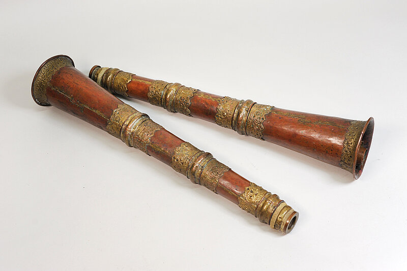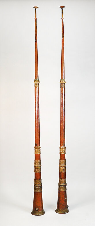Längstrompete aus dem Kontext klösterlicher lamaistischer Rituale in Tibet. Bei Anrufungsritualen spielen Blasinstrumente immer paarweise und werden auch so hergestellt. Zu einem Instrumentalensemble gehören neben den dungchen die Kegeloboen gyaling (vgl. Lo 71 bis Lo 73) und Schneckenhörner (dung kar); ferner die Schlaginstrumente  rol-mo (gebuckelte Paarbecken, vgl. Lo 76), silnyen (flache Paarbecken) und die Stieltrommel chos-rnga.