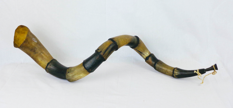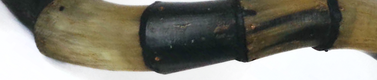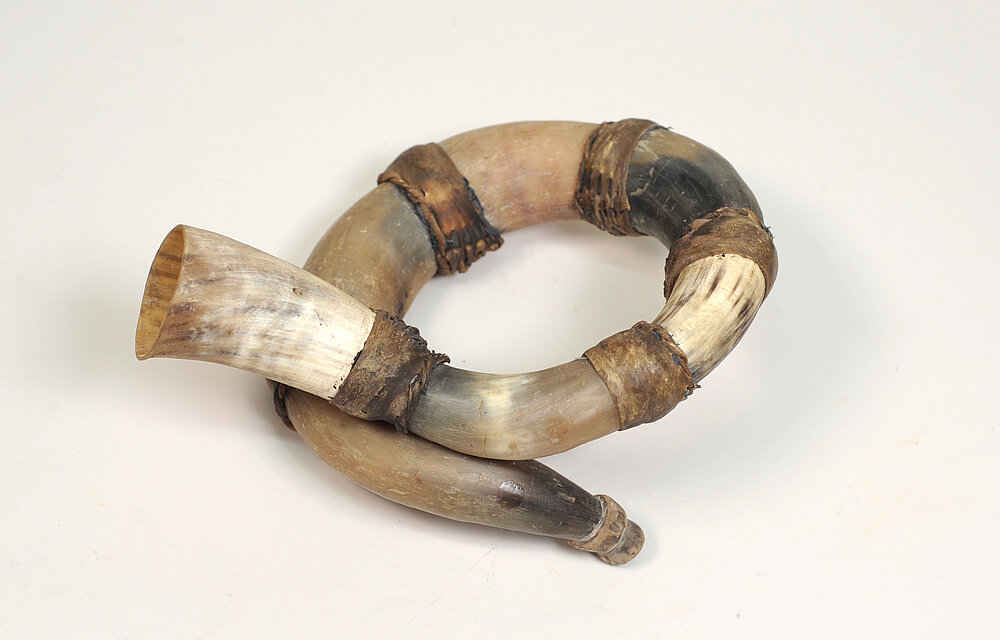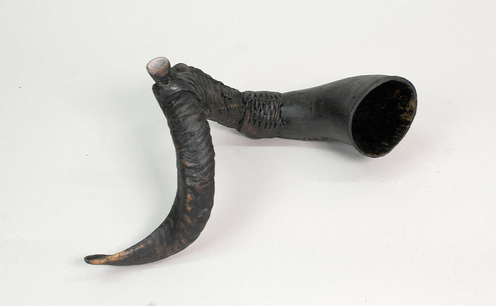 De 474: Kombination aus Widder- und Kuhhorn (Trichter), verbunden mit einem Lederstreifen. Das Mundstück (Horn) ist seitlich am Widderhornteil angebracht.