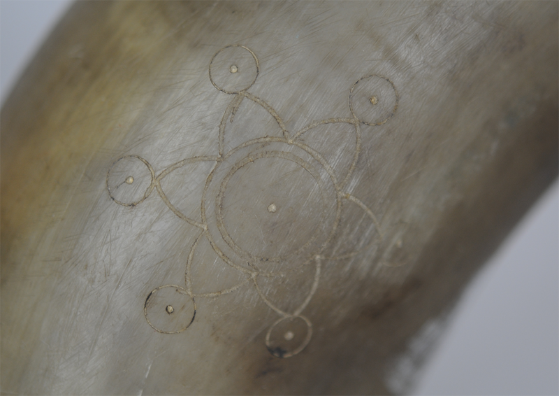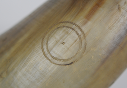 Zirkelornamente: Eingeritzte Zeichen (wohl Herstellerzeichen) auf dem Trichterstück (stilisierte Blume) und auf dem vierten Stück (mundstückseitig: konzentische Kreise).