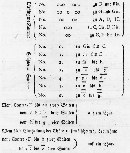 §. 15. Wegen der Stärke und Anzahl der Saiten gebe ich folgende ohnmaaßgebliche Eintheilung, welche ehemals bey Verfertigung solcher langmensurirten Clavierinstrumente unter meiner Aufsicht gebrauchet worden, wobey jedoch bisweilen etliche kleine Abänderungen erfolgen. [95]