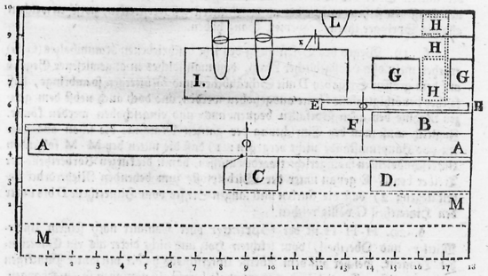 L ist der Springer zwischen I und K, unterschiedshalber mit lauter Puncten angedeutet. Er ist ebenfalls wie sein Treiber bey E von leichtem Holze, und nicht dicker als ein Clavicymbeltangent. Dieser Springer ruhet auf des Treibers langem Vordertheil, und findet seine Rechthaltung zwischen zwo Reyhen kurzer dünner Stiftgen, welche in dem starken viereckigten Stege K stehen, und herüber bis an den Steg I hervorragen.