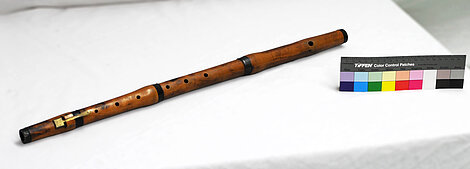 Rohrteile: Kopf, Mittelstück. Herzstück und Fuß. Wülste: eine schwache Rohrerweiterung in Höhe des Mundlochs. Ein Wulst am Ende des Kopfes, einer am Anfang des Herzstücks. Eine schwache Rohrerweiterung am Anfang des Fußes. Vier Ringe aus dunklem Horn, am Ende des Kopfes, am Anfang des Herzstücks, am Anfang und Ende des Fußes. Abschlußkappe am Kopf aus gebeiztem Birnbaum, flach, mit zwei eingedrehten Kreisen auf der Oberseite. Mit einem Zapfen. ebenfalls aus geb. Birnbaum, in das Rohr gesteckt. – Ovales Mundloch. Breite 1,02 cm, Höhe 0,86 cm.
